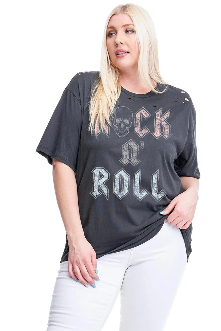This skull rock n roll graphic tee features distressing (small holes) throughout. Style with literally anything for a comfy and on-trend look. Relaxed fit. Black tee with peach, grey & baby blue vintage print.