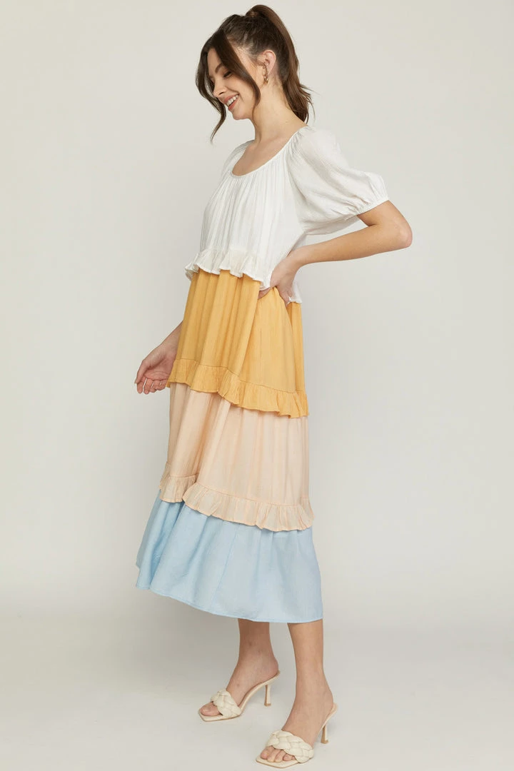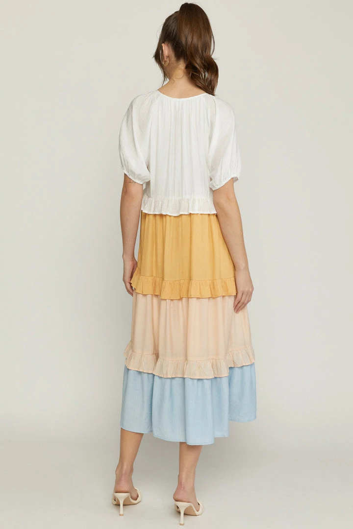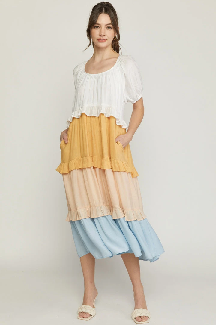 All the heart eyes for this pretty colorblock midi dress! Such an easy breezy fit that is cute and comfy. Dress has elastic cuffed short puff sleeves and features a relaxed silhouette, ruffled colorblock tiers, crew neckline, and pockets. Perfection! Colors: off white, dusty peach, pale pink, and light sky blue.