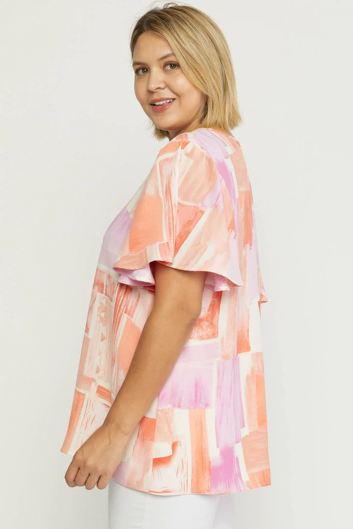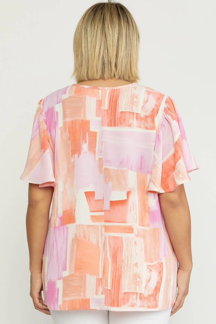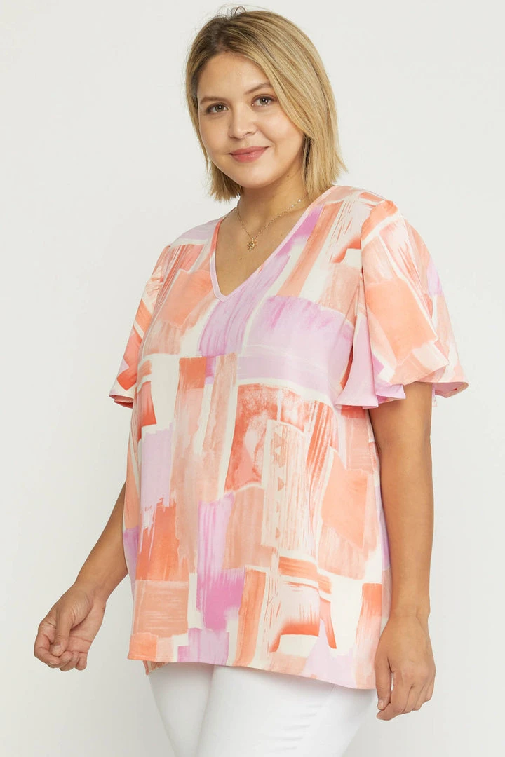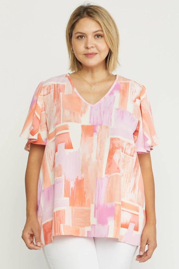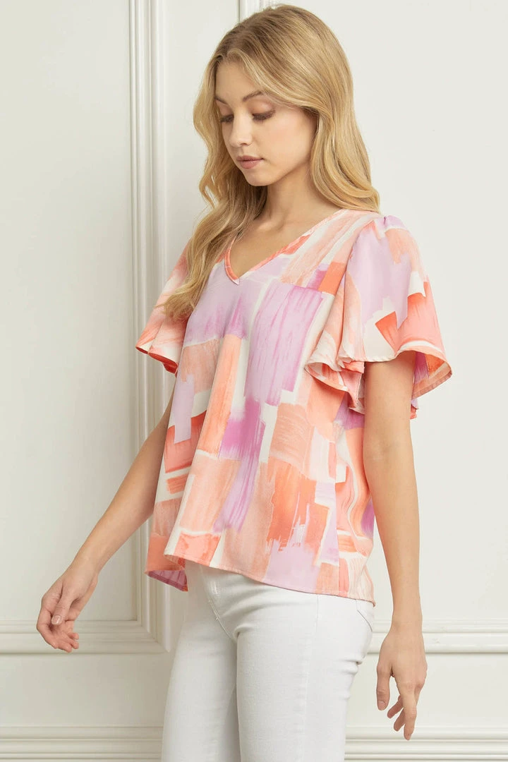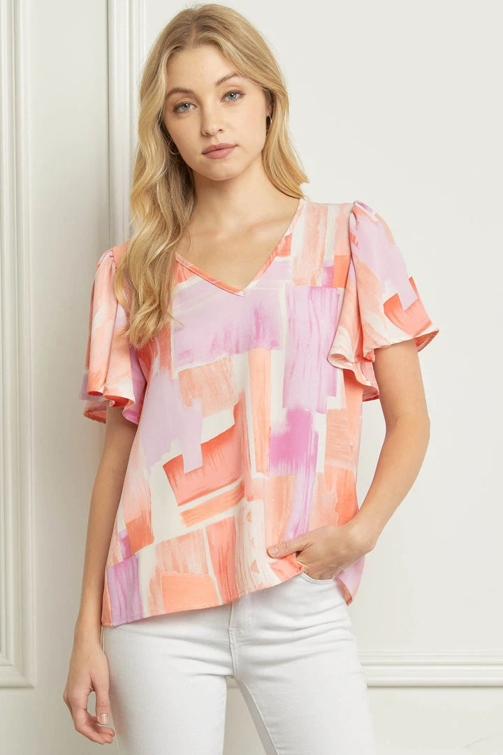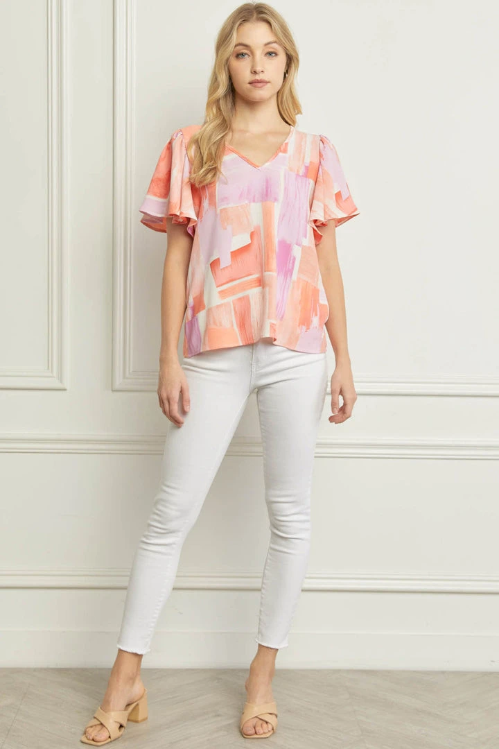 How pretty is this pink printed top!? Perfect for the upcoming seasons… just add your favorite jeans and booties, then shorts and sandals as the weather warms. Featuring a v neckline with short flutter sleeves. So cute! Colors: dark pink, light pink, coral, mauve, and ivory.