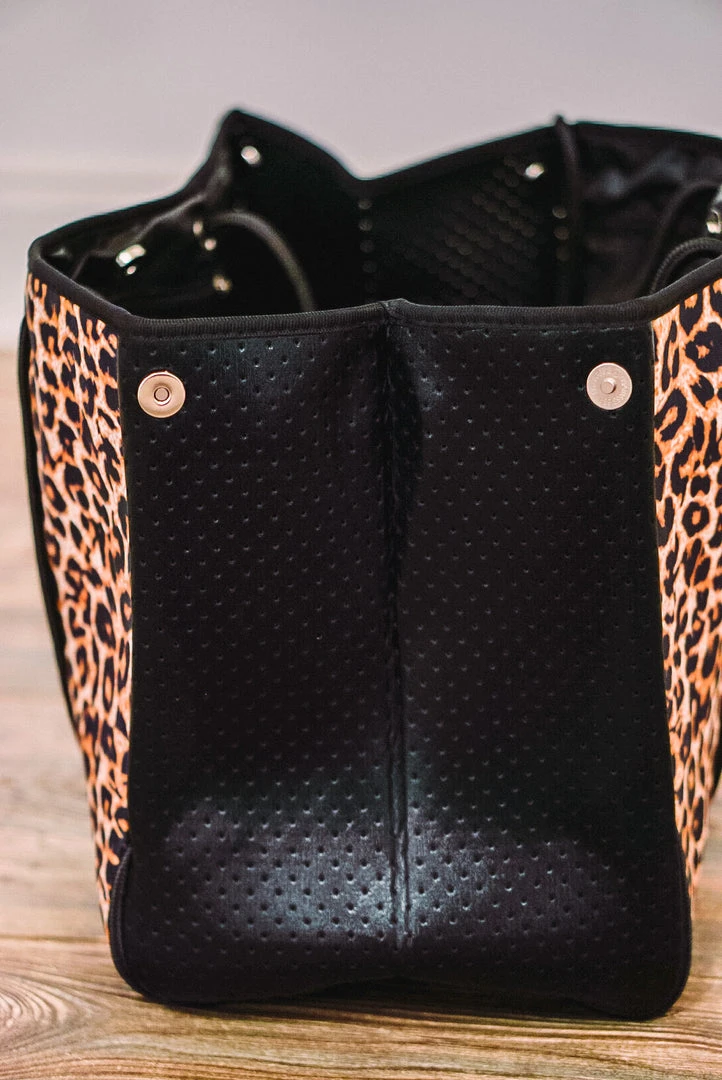 The super lightweight neoprene tote bag that you need in your life! Not only is this bag a necessity for you, but also great for a gift! Small matching removable pouch inside! Nothing better than two bags in one! Tote features a middle snap closure, snaps on the side to allow bag to expand, two inside zippers, rope handles, hard botton liner.