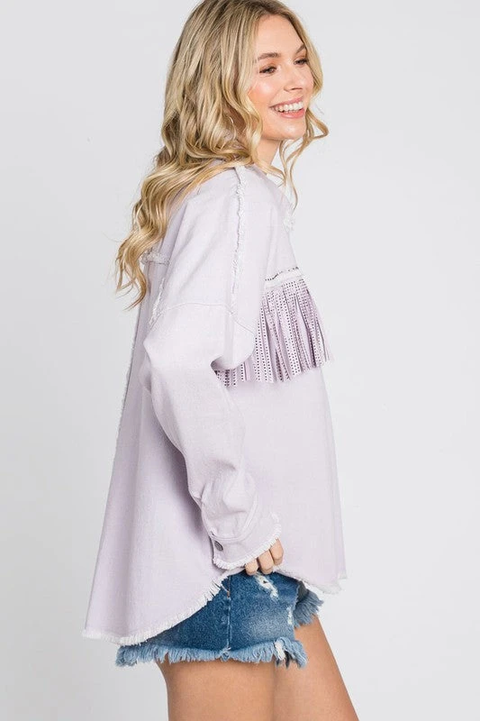 A fun, lightweight jacket with a TWIST! This lilac twill jacket is a MUST have to rock all year long! Jacket features rhinestone fringe across the chest, raw frayed seam details, slight hi-low bottom hemline, and a comfy relaxed fit. This babe is absolute perfection!