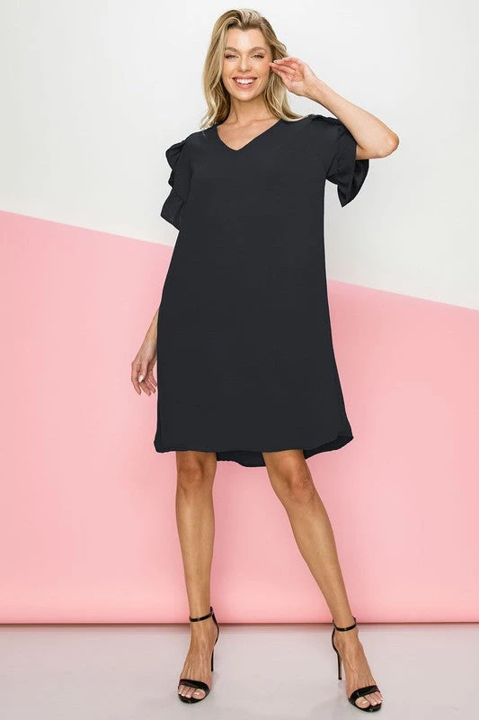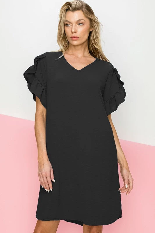 Black shift dress with ruffled sleeves