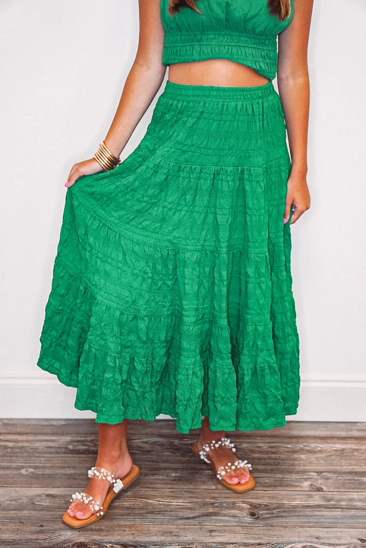 We are in cuteness overload with this adorable midi skirt! Featuring a lightweight textured flowy fabric, elastic waistline, ruffled bottom hemline, and tiered layers. The perfect skirt, simple yet so pretty! Shop the matching top here! Also super cute to mix & match with different tops, even a graphic tee and sneakers for a fun edgy vibe!