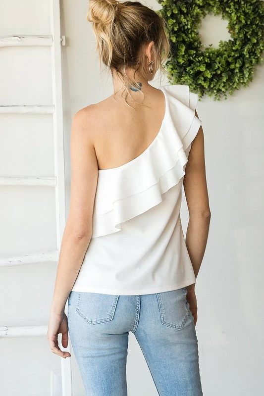 One shoulder off white top with layered ruffle detail