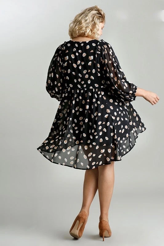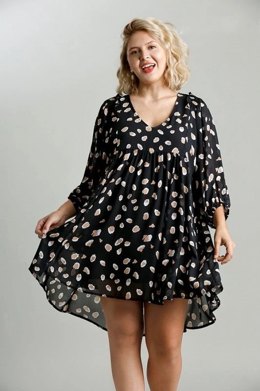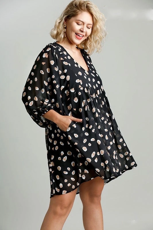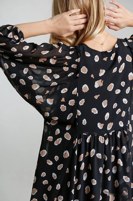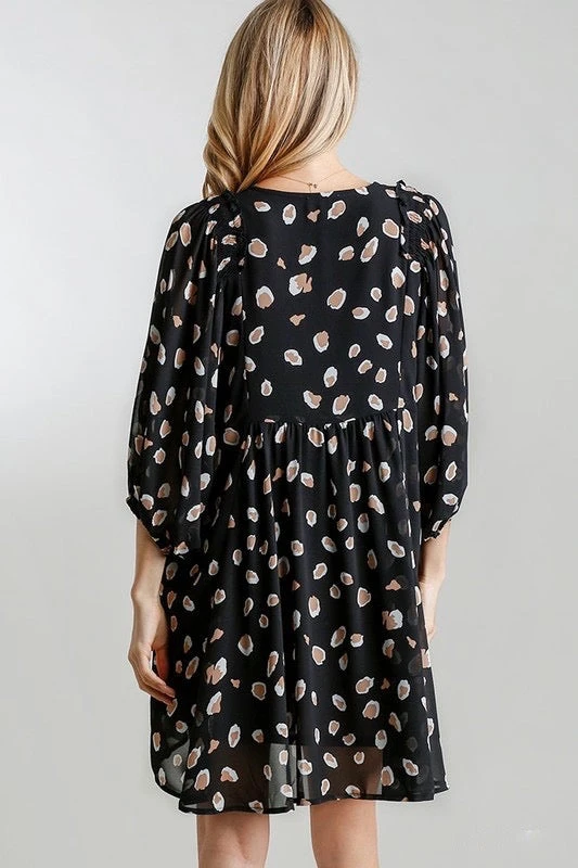 You will be chasing this dress until you get it! The cutest babydoll dress featuring a classic animal print, v neckline, elastic cuffed bubble sleeves, and ruffle smocked detailing on the shoulders. We are loving everything about this dress… the color, the print and the lightweight flowy fabric!
