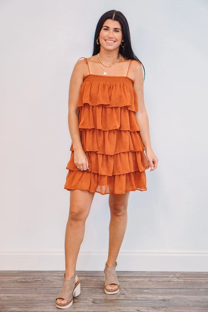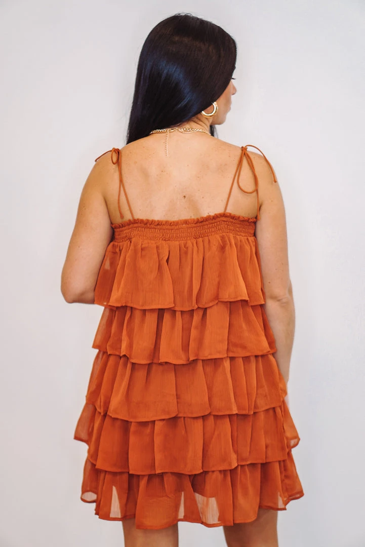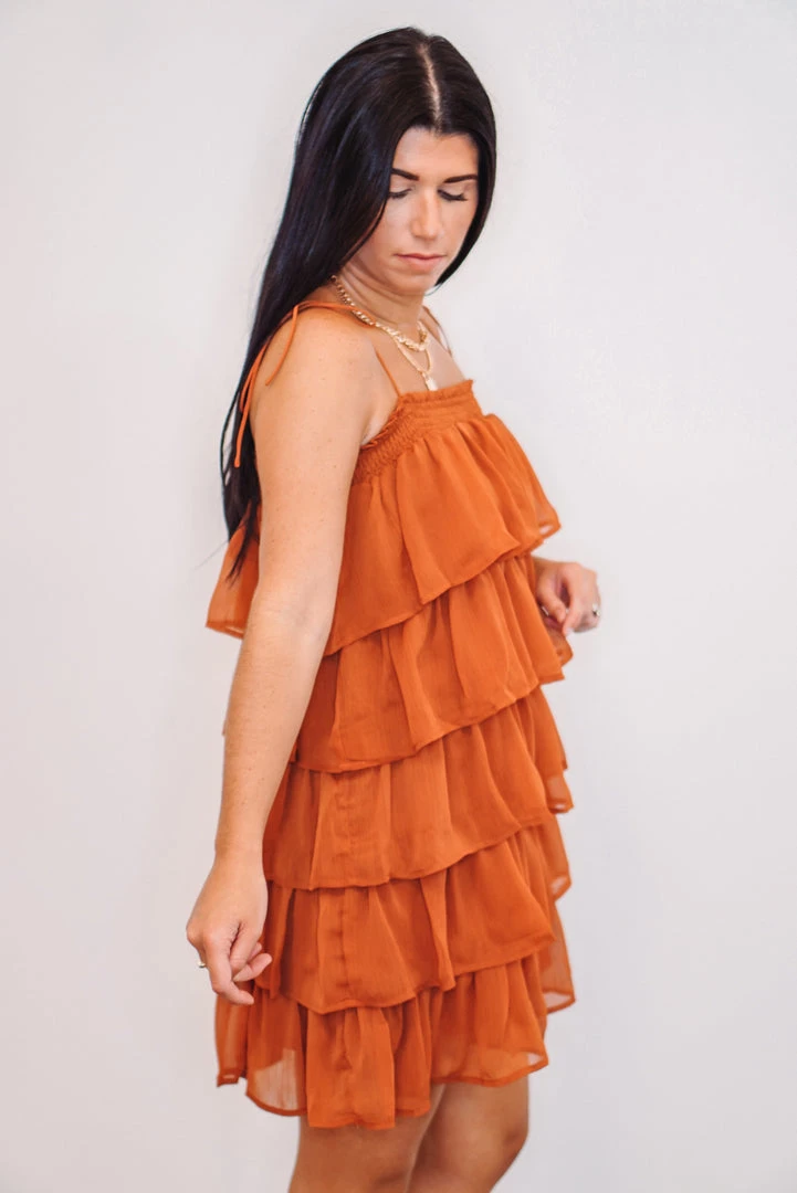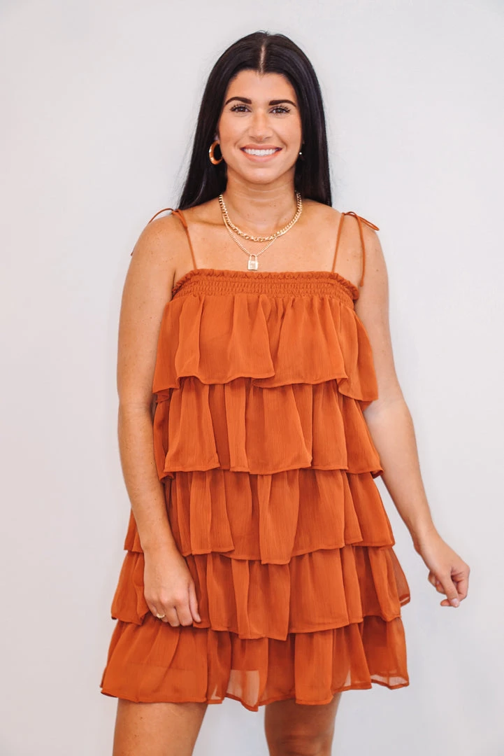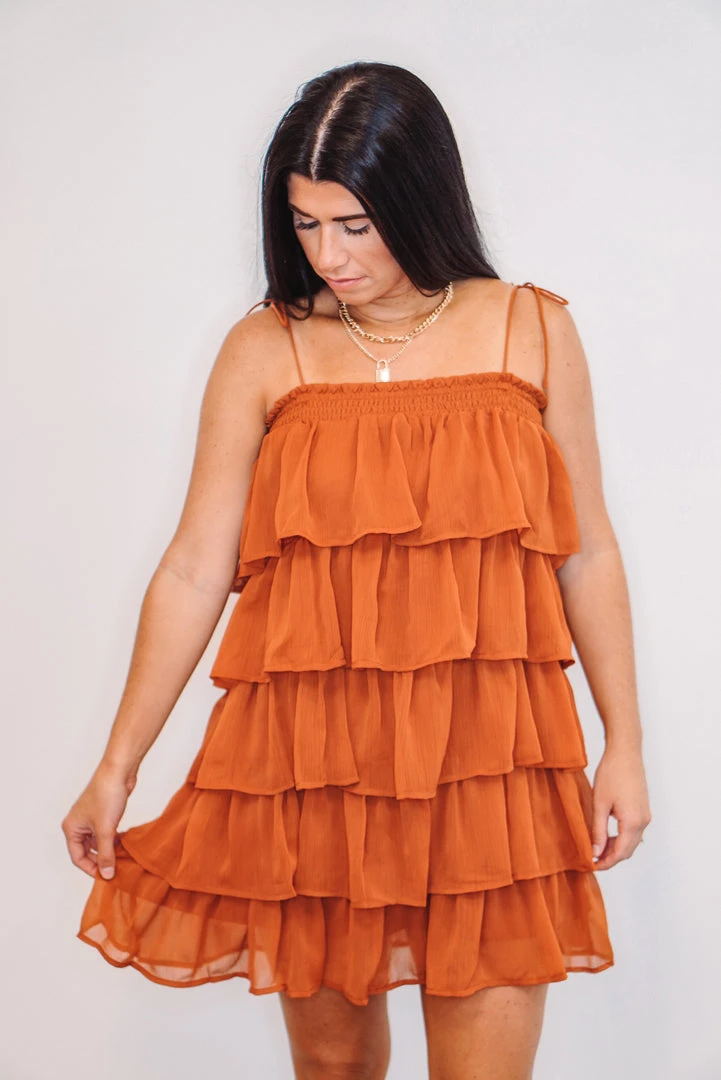 Rustic brown ruffle tiered mini dress with spaghetti straps