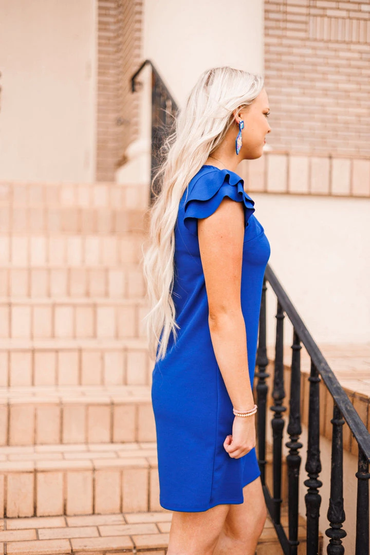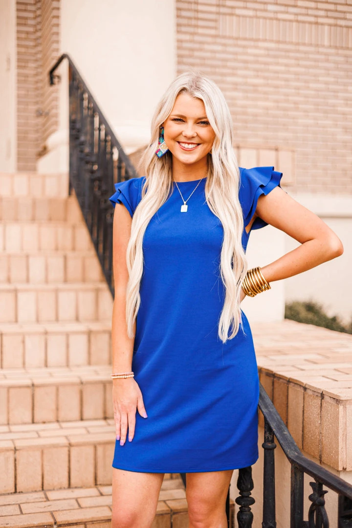 Sweet meets sassy in this super cute royal dress. Featuring a crew neckline, and ruffle capped sleeves. This one will be perfect dressed up with heels and chunky jewelry, or dressed down with sandals and a denim jacket, the choice is all yours. This babe will adorable for those upcoming graduation celebrations!