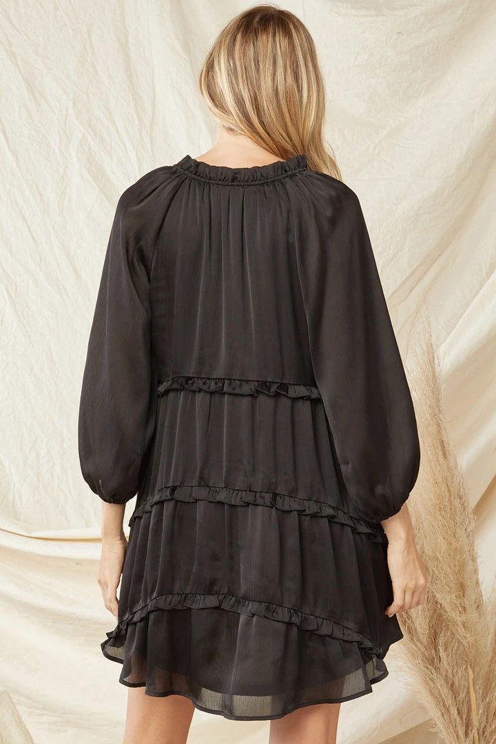 Black satin tiered ruffle babydoll dress