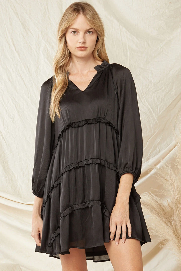Get ready for all of your upcoming special events with this super sweet babydoll dress. Featuring a lightweight flowy satin fabric, v neckline with ruffle around neck, elastic cuffed 3/4 length sleeves, and tiered ruffles. This babe is perfect dressed up with heels, or wear her under your favorite cropped denim jacket with booties for a more casual look.
