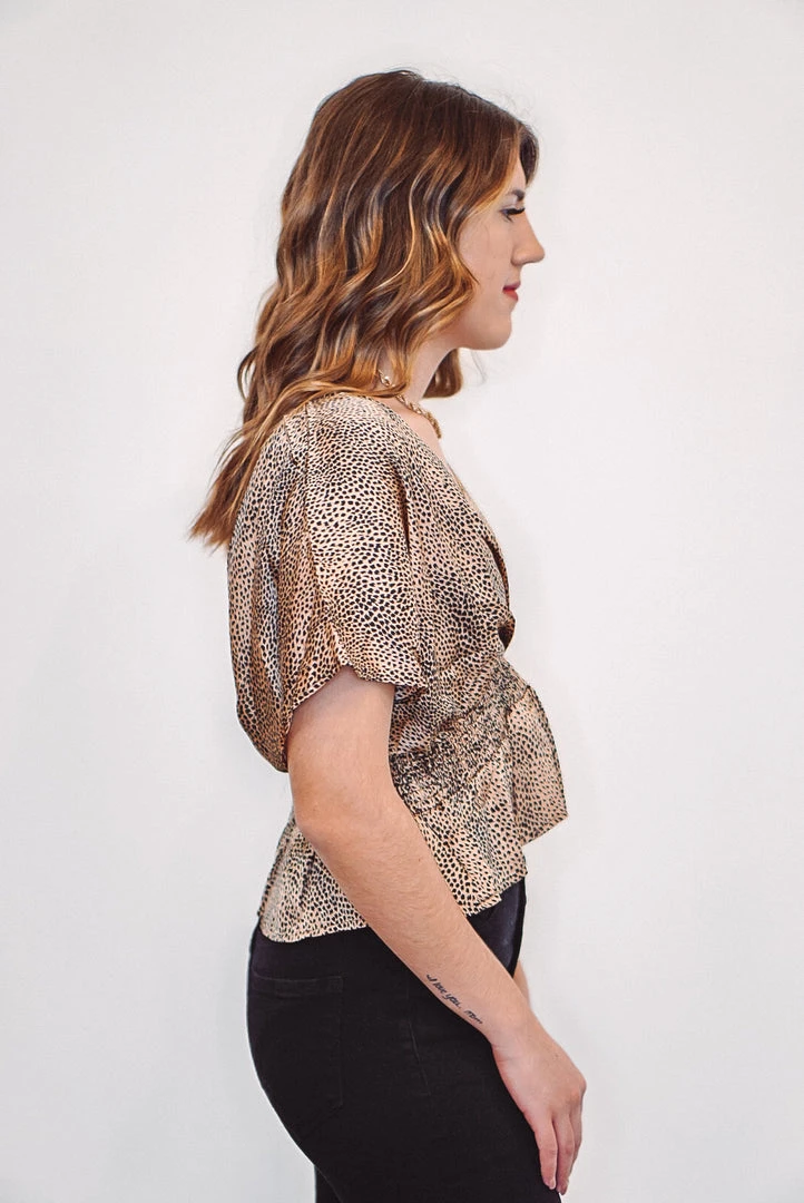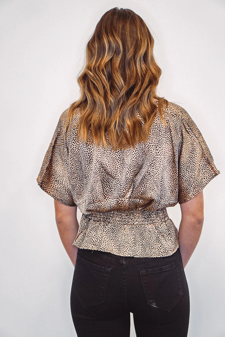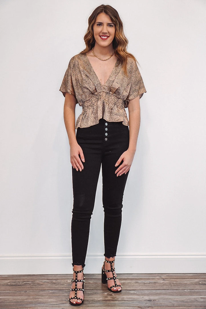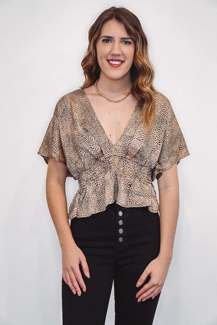 A dressy little top that is perfect for a night out or even for Holiday parties! This babe features a satin like fabric with a v neckline and smocked waist, making for a very slimming and flattering fit!