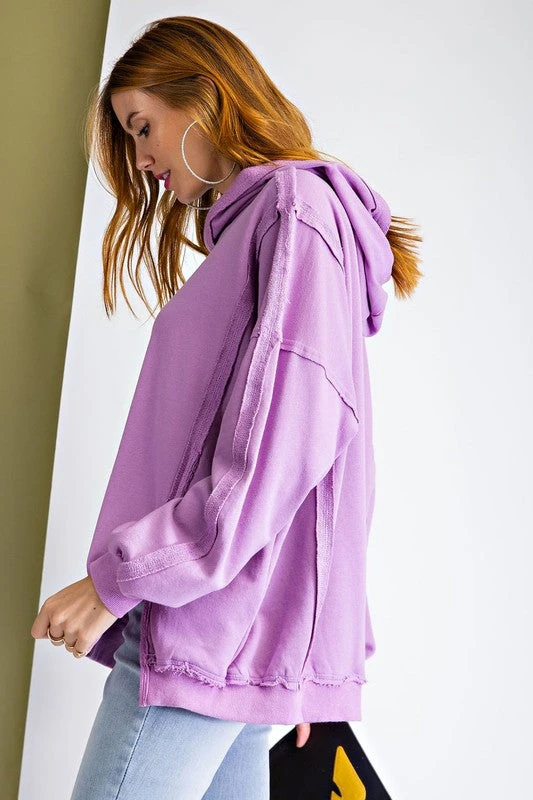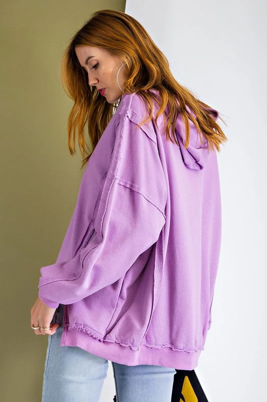We are having all the feels for this lavender washed french terry hoodie! So comfy, and super cute. Featuring a relaxed fit, exposed seam details, side pockets, banded long sleeve cuffs and bottom hemline which also has side slits for added comfort. You will love how great you feel in this babe, while running errands, hanging out with friends, or enjoying a much deserved day off.