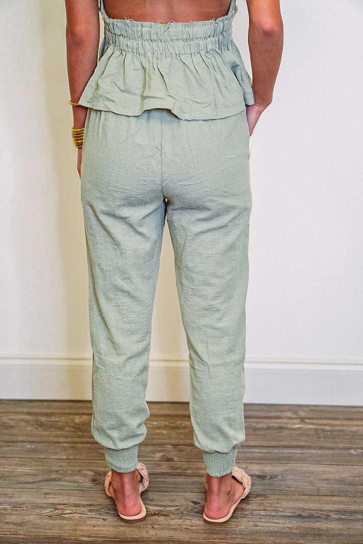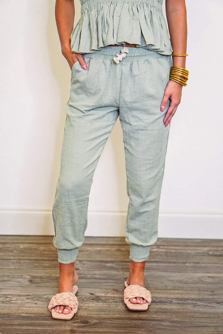 We love a good pair of jogger pants, and these babies are super cute! They are a lightweight fabric in soft olive, with an elastic waistband and rope cord drawstring, front pockets, and smocked cuffed ankles. These babes will have you feeling so comfy while looking fab, you’ll want to wear them everyday! Pair with the matching top for a super cute day out: Seaside Dreams Olive Halter Top.