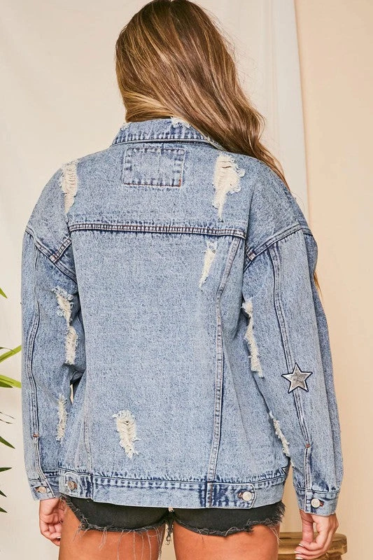 Sequin Star Blue Jean Distressed Denim Jacket