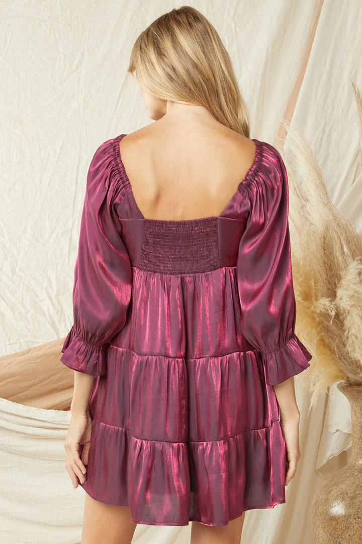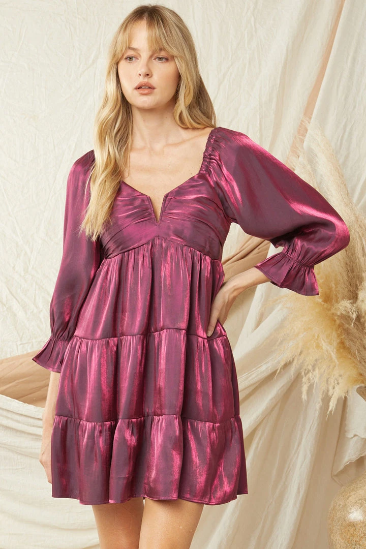 Sweet meets sassy in this super cute grape babydoll dress. Featuring an iridescent flowy fabric, tiered layers, wire insert v cut neckline, smocked back, and ruffled cuffed 3/4 length sleeves with elastic at the shoulder. This one will be perfect dressed up for all of your upcoming events, and is so pretty!