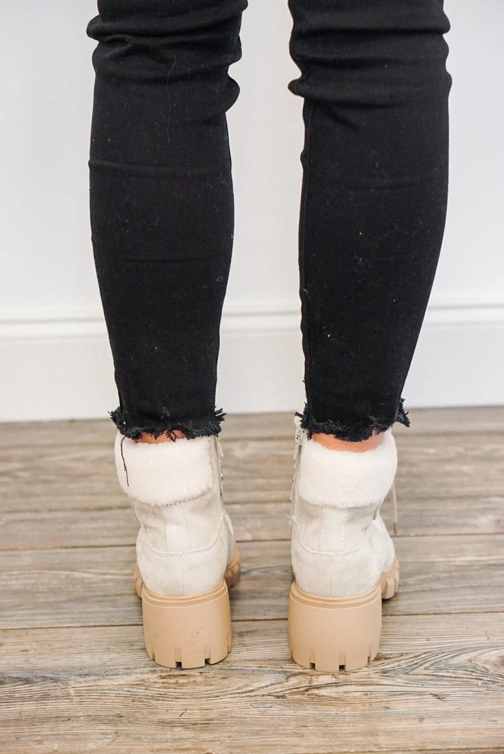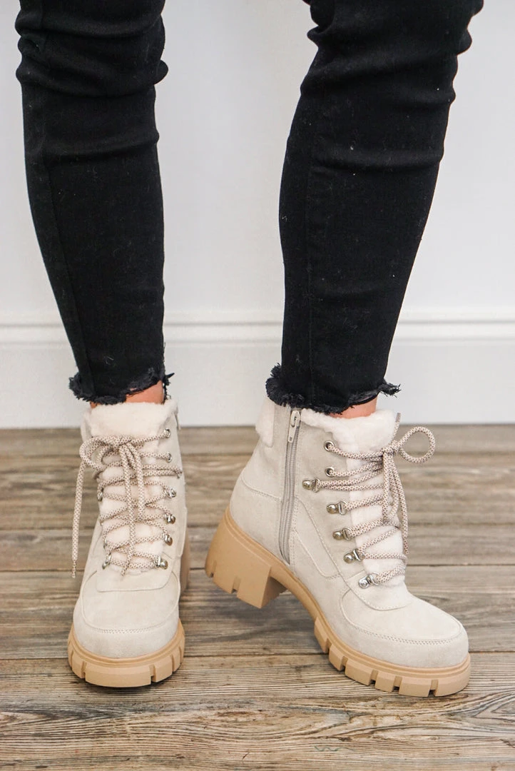 Faux fur military lace up beige boot