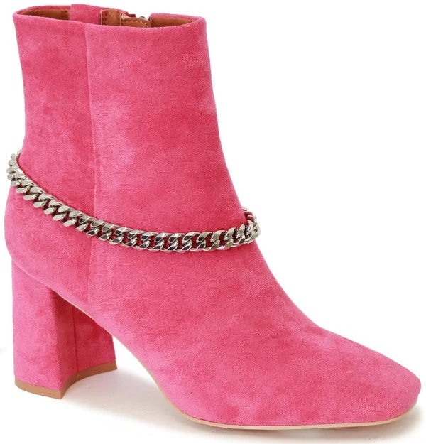 WOW…we are in love!!! Such a gorgeous pink color, you will be buying the outfit to match the fuchsia boots:)… not really because they will pair with more than you think. We are loving them paired with graphic tees and denim or dressed up with a beautiful dress. How ever you style them you need them that that fun pop of color. Fun pink bootie with a removable silver chain.