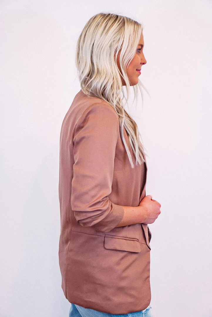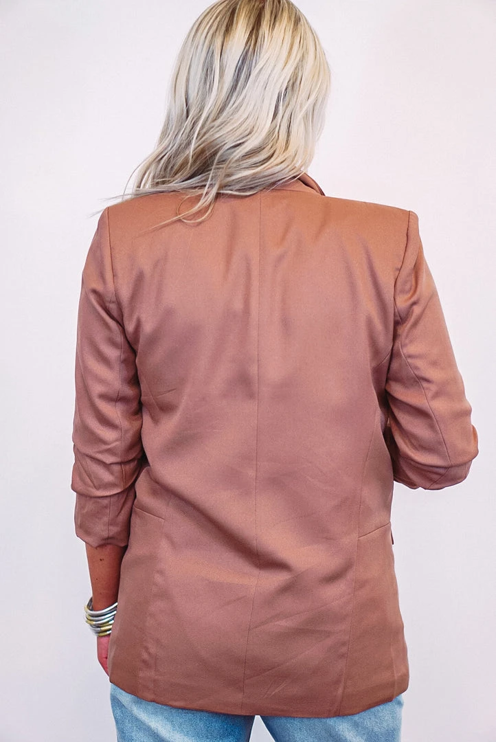 Blazers are all the trend right now, and this hazelnut one is perfect! This beauty features a woven fabric, with shirred detailing on the 3/4 length sleeves. She also has a relaxed silhouette fit, with faux pockets for a tailored look that lays smooth, and a small shoulder pad to give just the right Omph! Dress this baby up or down!