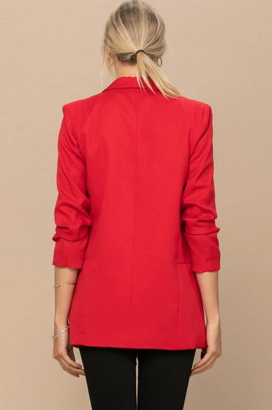 Blazers are all the trend right now, and this red one is perfect! This beauty features a woven fabric, with shirred detailing on the 3/4 length sleeves. She also has a relaxed silhouette fit, with faux pockets for a tailored look that lays smooth, and a small shoulder pad to give just the right Omph! Dress this baby up or down!