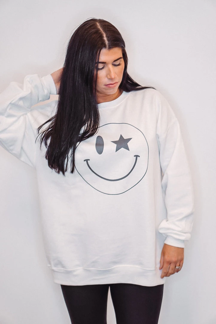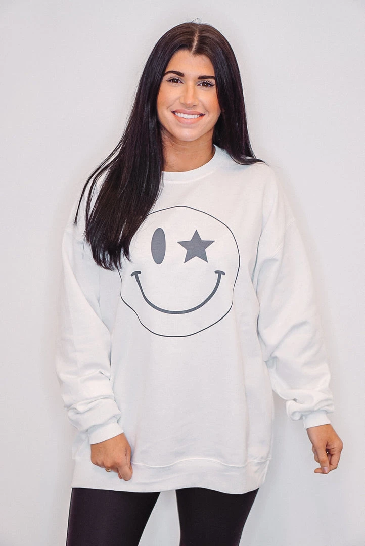You will be happy in this oh so cute but comfy sweatshirt. The smiley face is such a fun trend and we are loving this fun star smiley design! Featuring crew neckline, cuffed long sleeves, and banded bottom hemline. Also in YOUTH HERE!