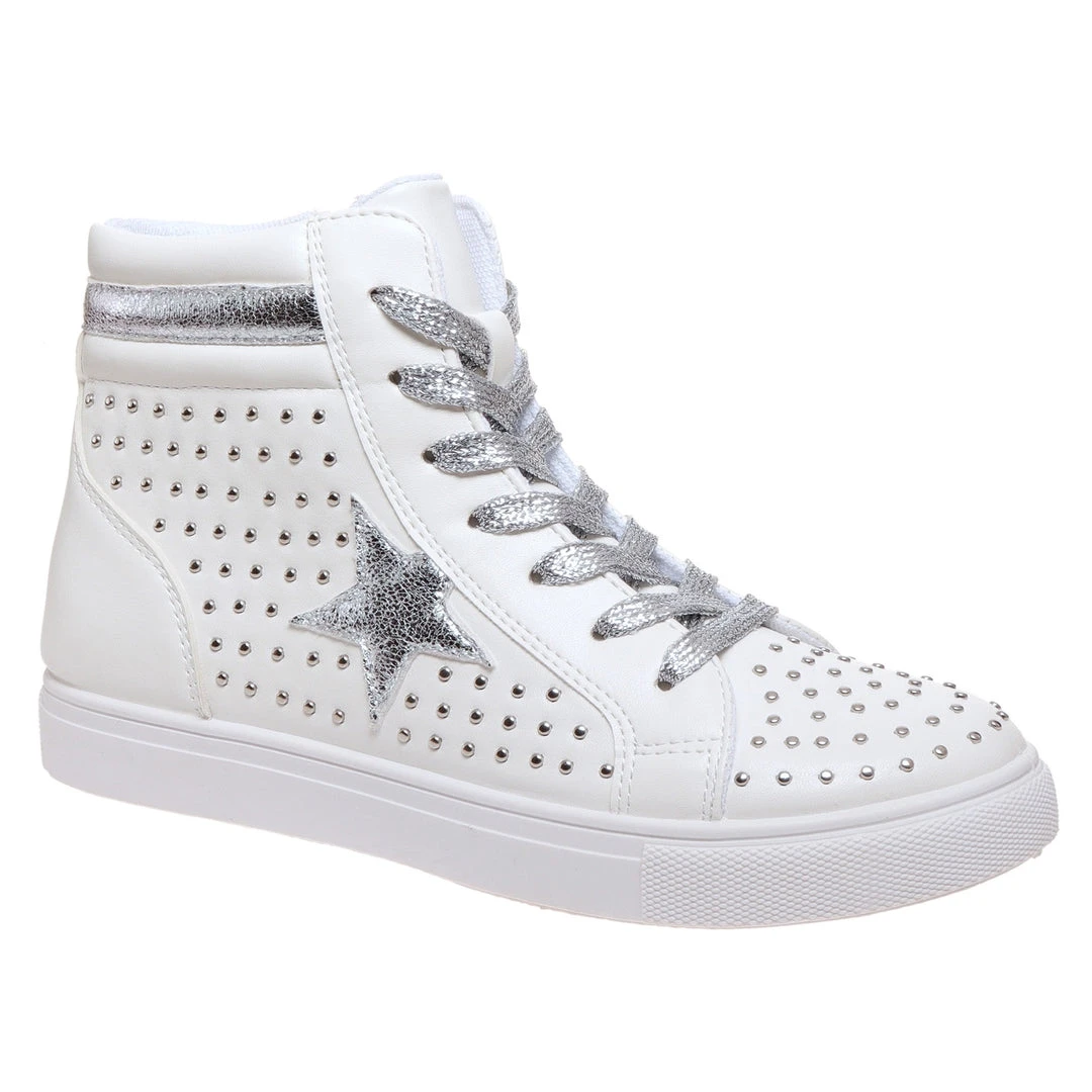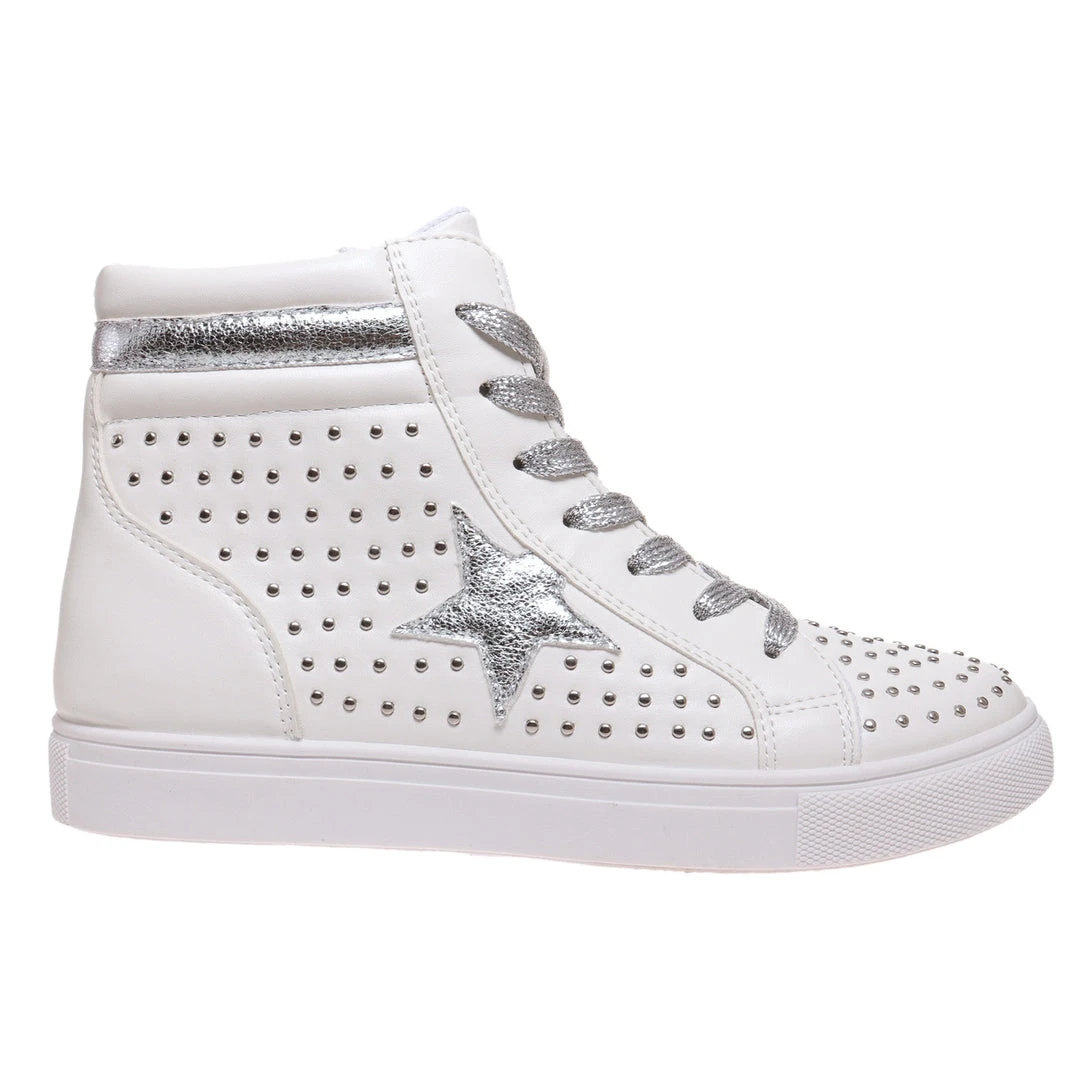White and silver studded star high tops.