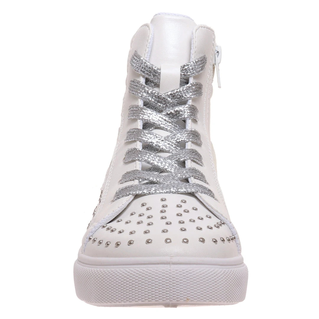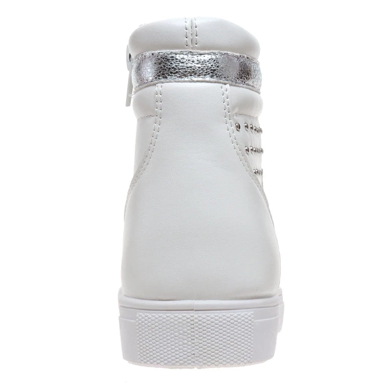 These fun slip on high top sneakers are a stylish choice for ladies who are always on the go! This sneaker features a white color with a silver studs and silver detailing. The inside features a lightly padded insole, while the bottom features a treaded rubber outsole. Pair with jean shorts and a graphic tee for a fun look!