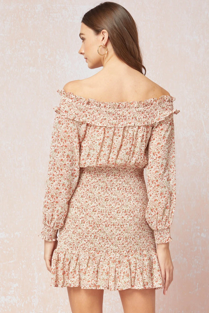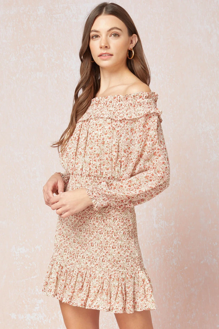 We are floral obsessed with this off the shoulder long sleeve dress! Featuring smocked details at the neckline, the sleeve cuffs, and from the waist down, with a ruffled hemline, and ruffles around the neckline. The lightweight fabric is super cute and comfy. This babe will be perfect all year long, just add boots or booties, and a denim jacket and you’re all set!