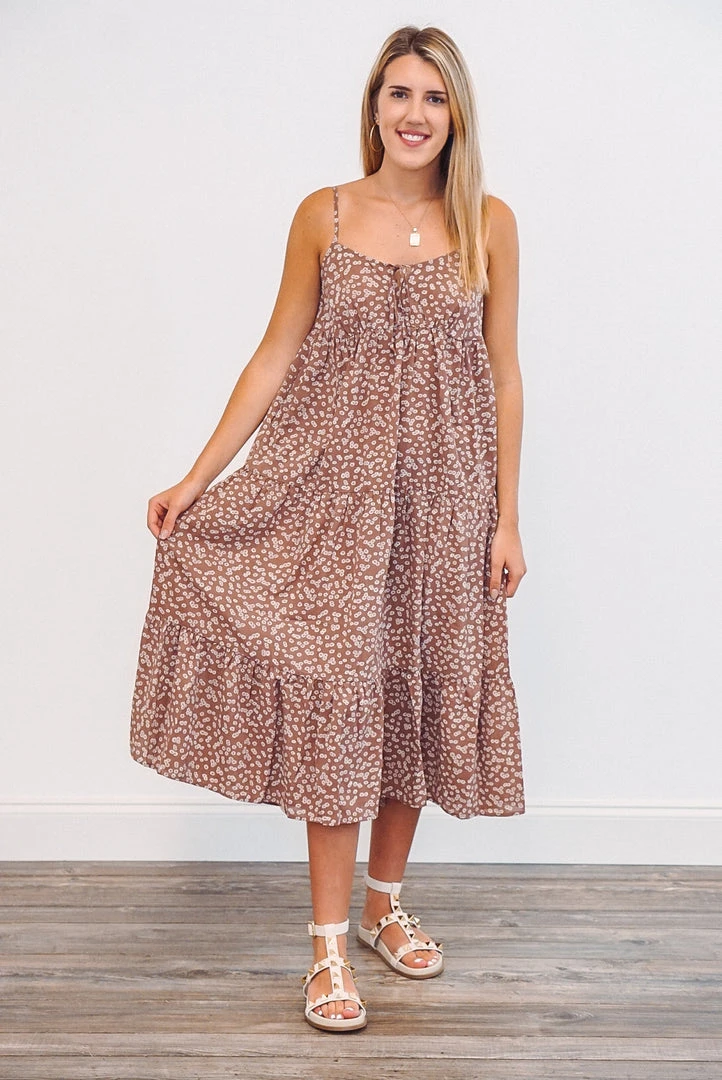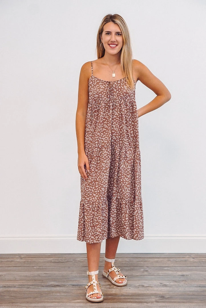 We love the Boho life! This super cute midi dress is dark mauve with ivory daisies and a tiered flowy silhouette. Featuring adjustable spaghetti straps, and self tie keyhole neckline. So cute and fun!