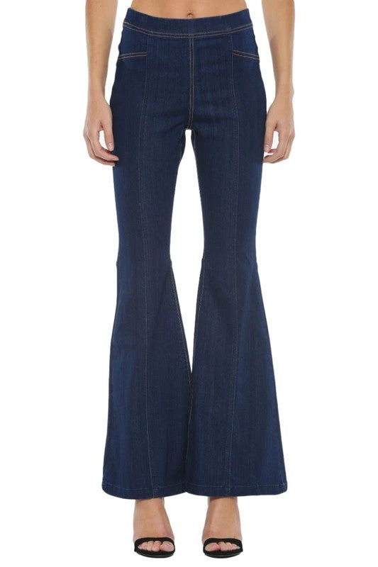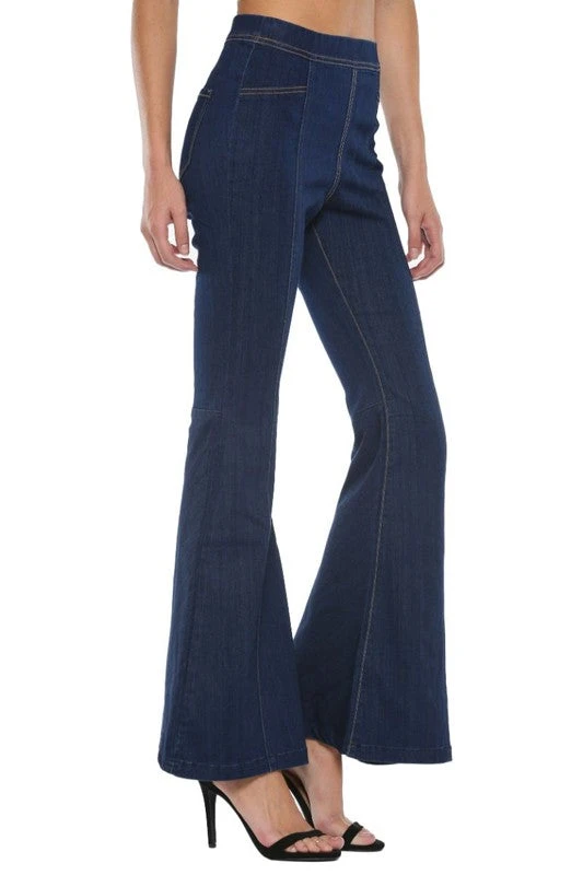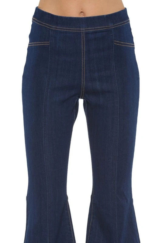 Love these pull on denim flares! So comy yet so trendy! An instant classic, these effortless pull-on flares are designed to accentuate your shape while taking your look to the next level. seam down the center gives you leggs for days!! Easy pull on, no buttons or zipper.