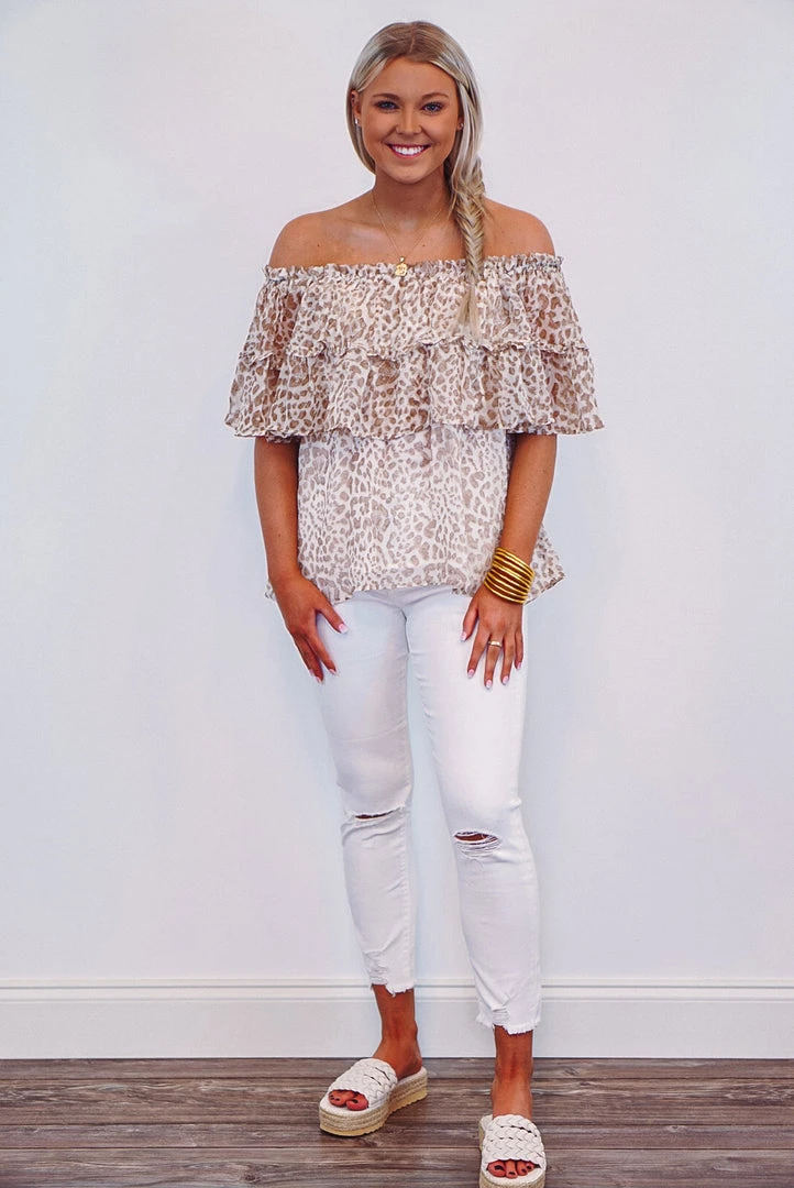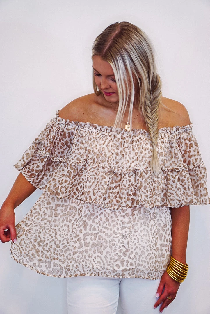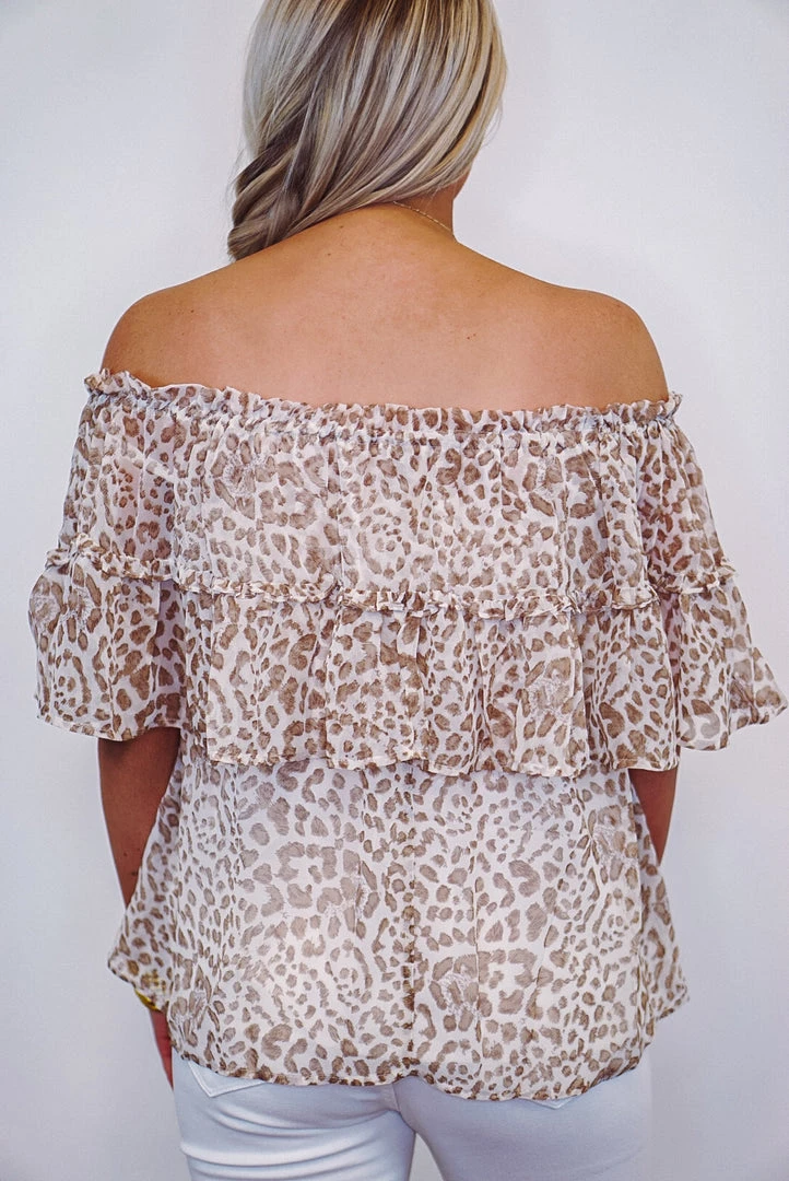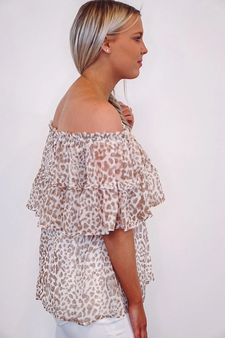 Tan and ivory cheetah print off the shoulder top.