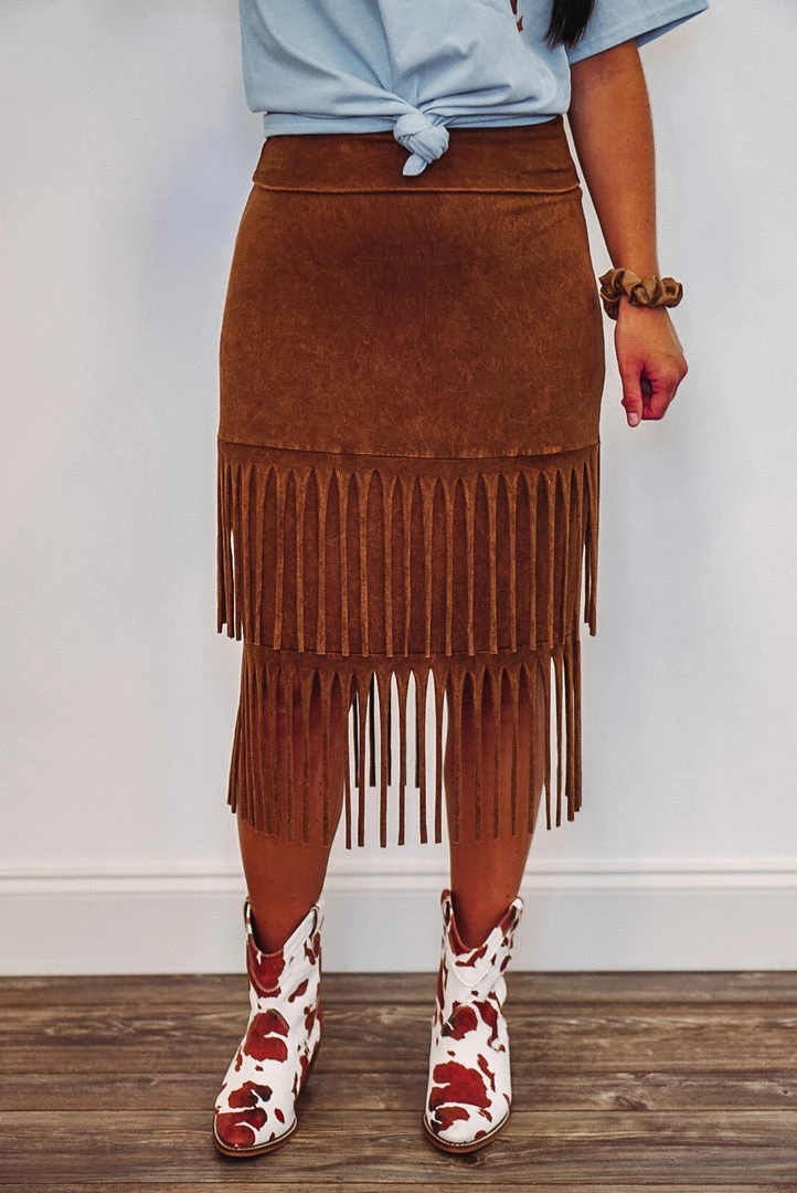 This adorable washed camel fringe midi skirt will make your cowgirl dreams come true! Featuring a layered fringe hemline, and our favorite mineral washed fabric, with a waistband that can be worn up high or folded down low to fit your preference. Super cute and comfy, and absolutely perfect for all of those upcoming concerts and festivals. Just grab your cowgirl boots and go!