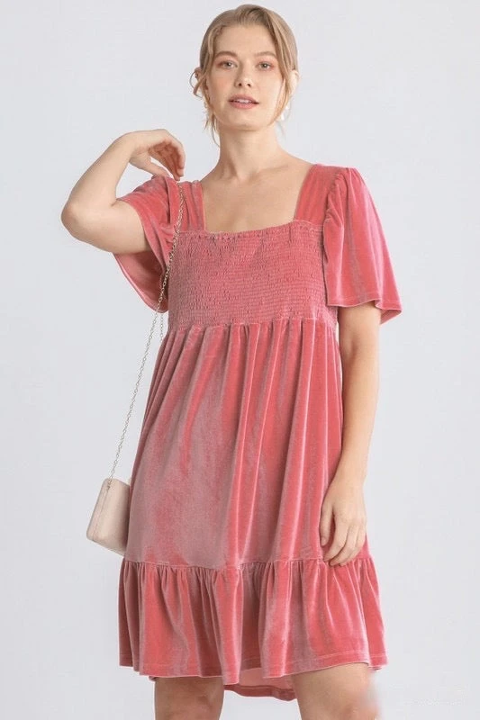 We are here for this one girls! Smocked babydoll style dress in rose quartz velvet! Featuring a smocked top with a square neckline, and self tie closure in back, ruffled short sleeves and a ruffled hem at the bottom. This beautiful babe is fully lined, and has a true to size fit. She’ll be perfect for any occasion, from special events, to casual dates.