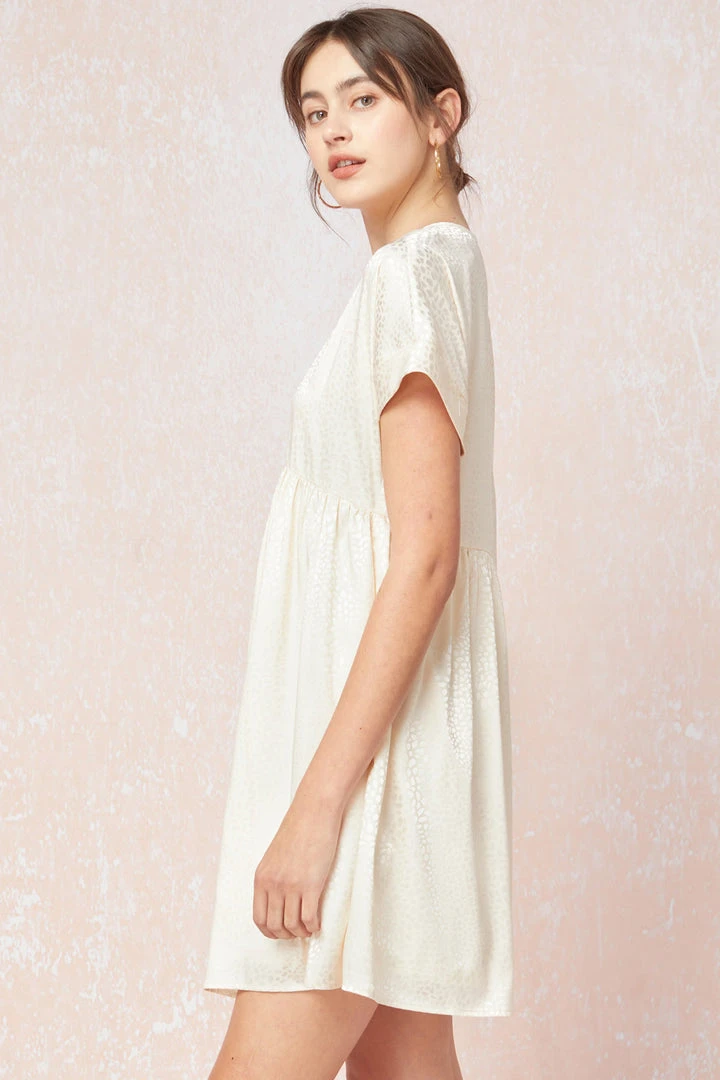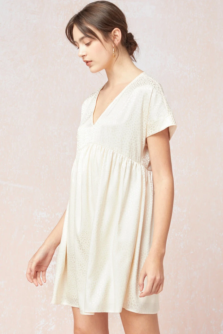 The most loved babydoll fit dress in a fabulous satin spotted spring! Cream dress features a v neckline, cuffed sleeves & side pockets (lays flats on the body). This would be the perfect dress for your bridal showers!