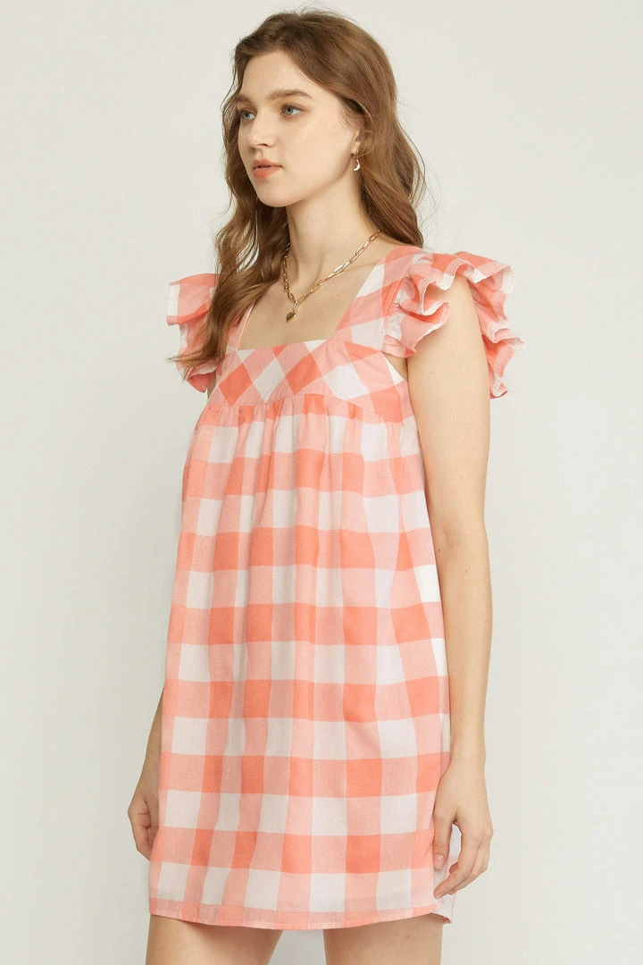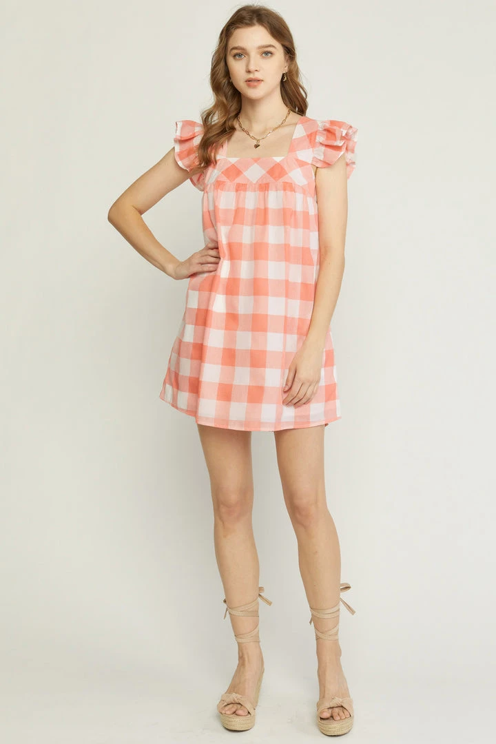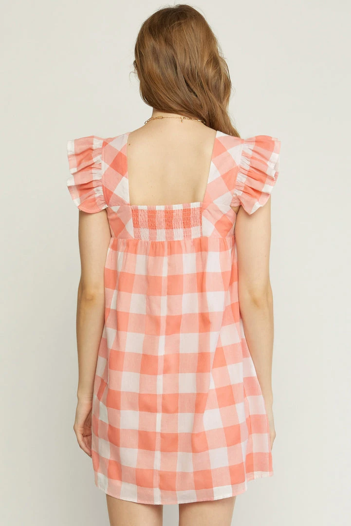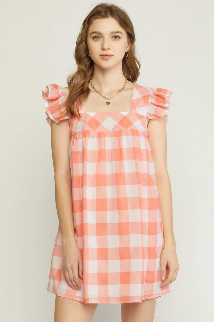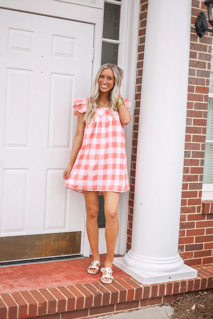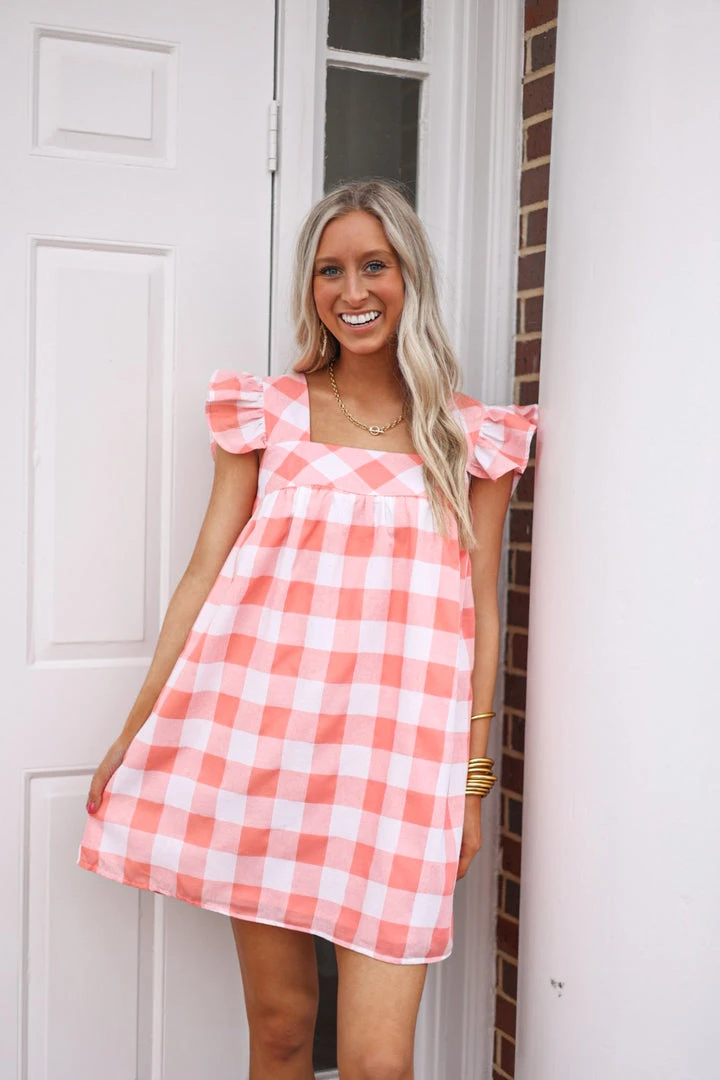 Get ready for all of your upcoming events with this super sweet babydoll dress. Featuring a lightweight flowy peach and white gingham fabric, square neckline with smocked back, and ruffle capped sleeves. This babe is perfect dressed up with heels, or wear her under your favorite cropped denim jacket with booties for a more casual look.
