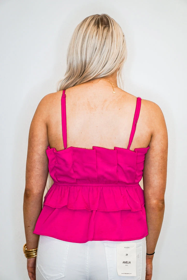 We can hear Summer calling with this adorable ruffle blouse! Featuring a lightweight magenta fabric in a peplum style with ruffle layered detailing, and adjustable spaghetti straps. Such a perfect top! Pair her with a highwaisted skirt and heels for a dressier look or keep it simple with cut off denim and sandals – such a versatile and timeless piece!