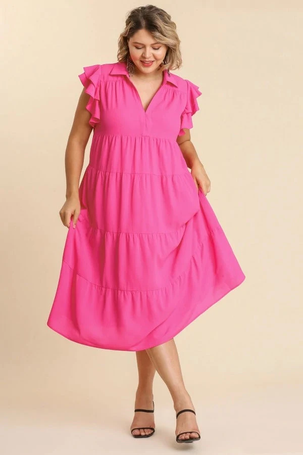 This super cute flowy midi dress features a very pretty hot pink fabric, with a collared v neckline, short ruffle sleeves, and tiered layers. The perfect dress for all of your upcoming occasions!