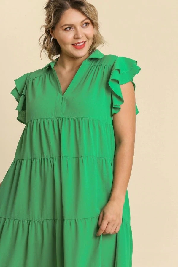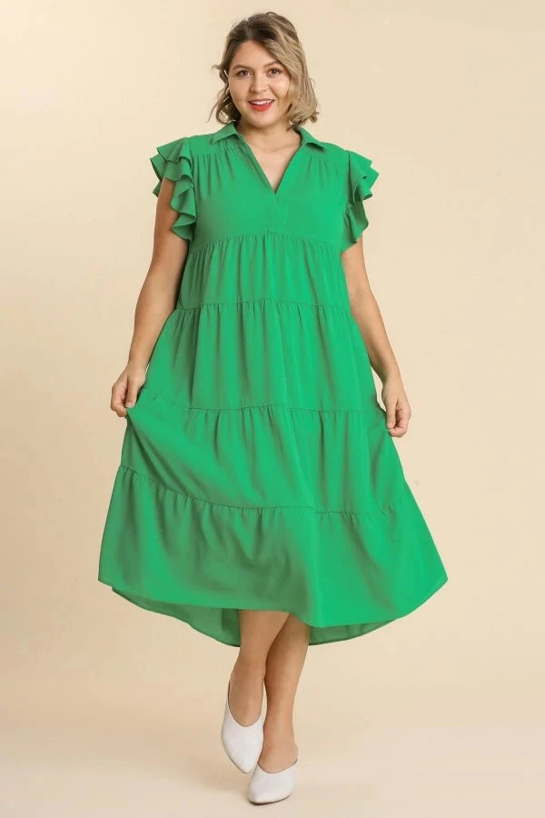 This super cute flowy midi dress features a very pretty kelly green fabric, with a collared v neckline, short ruffle sleeves, and tiered layers. The perfect dress for all of your upcoming occasions!
