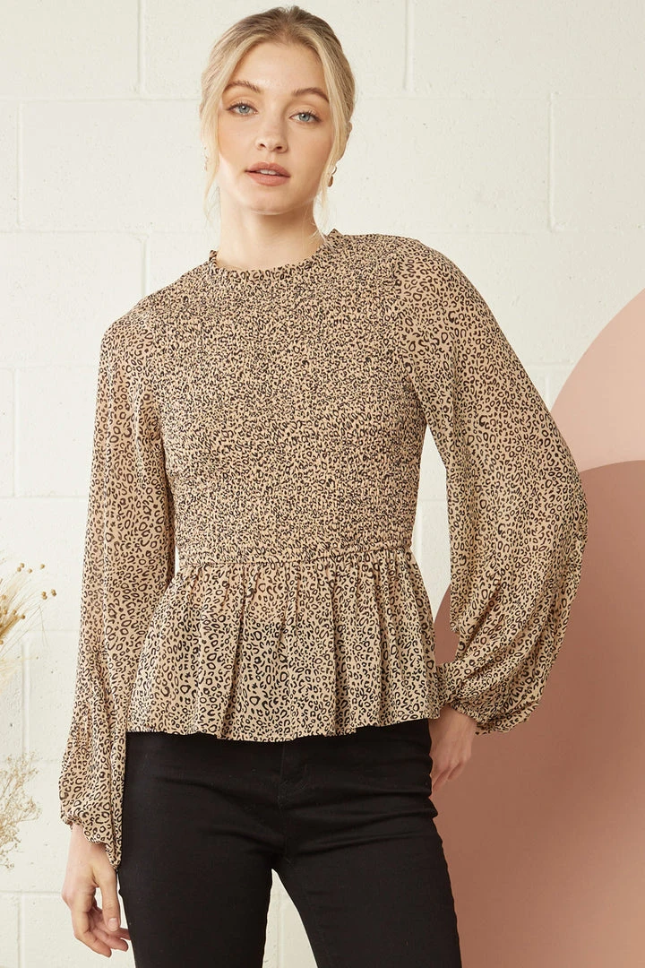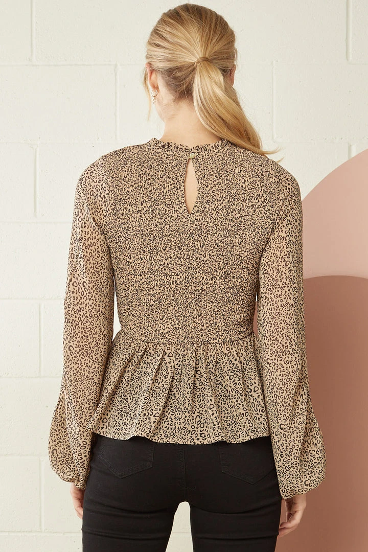 Taupe and black mini leopard print smocked peplum top