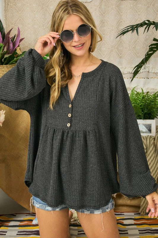 The cutest top for this Fall and Winter! You will be wearing this textured knit babe every day because she’s as comfy as she is cute. Featuring a relaxed fit in a peplum style, faux button details under the v neckline, and cuffed long puff sleeves. Perfect worn long, or with a side tuck. Just add your favorite denim and you’re ready for anything!