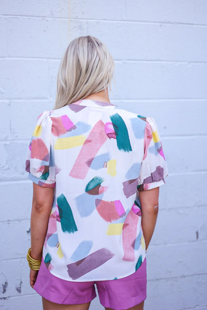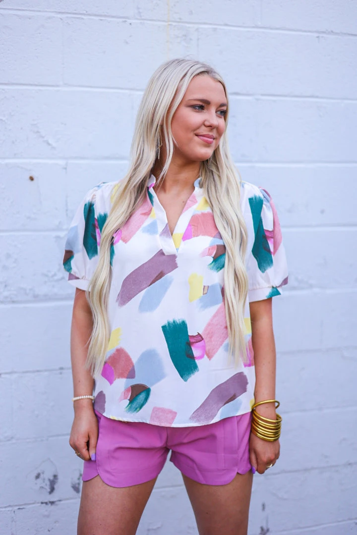 How pretty is this abstract painted print top!? Perfect for the upcoming seasons… just add your favorite jeans and booties, then shorts and sandals as the weather warms. Featuring a v neckline and gathered detail on the cuffed short sleeves. So cute! Colors: ivory, dark pink, dark blush, eggplant, sky blue, dark teal, and yellow.
