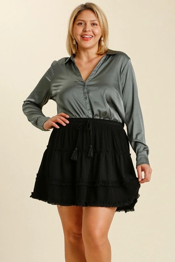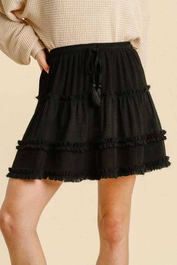 The little black skirt that ya need! Look at that ruffle tiered detailing!! It’s great for summer time because of the lightweight fabric! Skirt features an elastic waist band and functioning tassel drawstring. Also come in plus sizes!