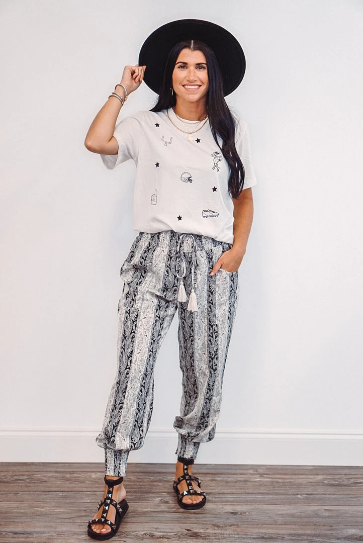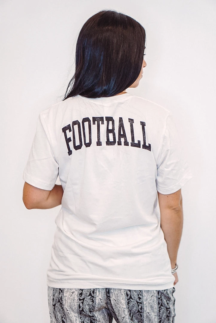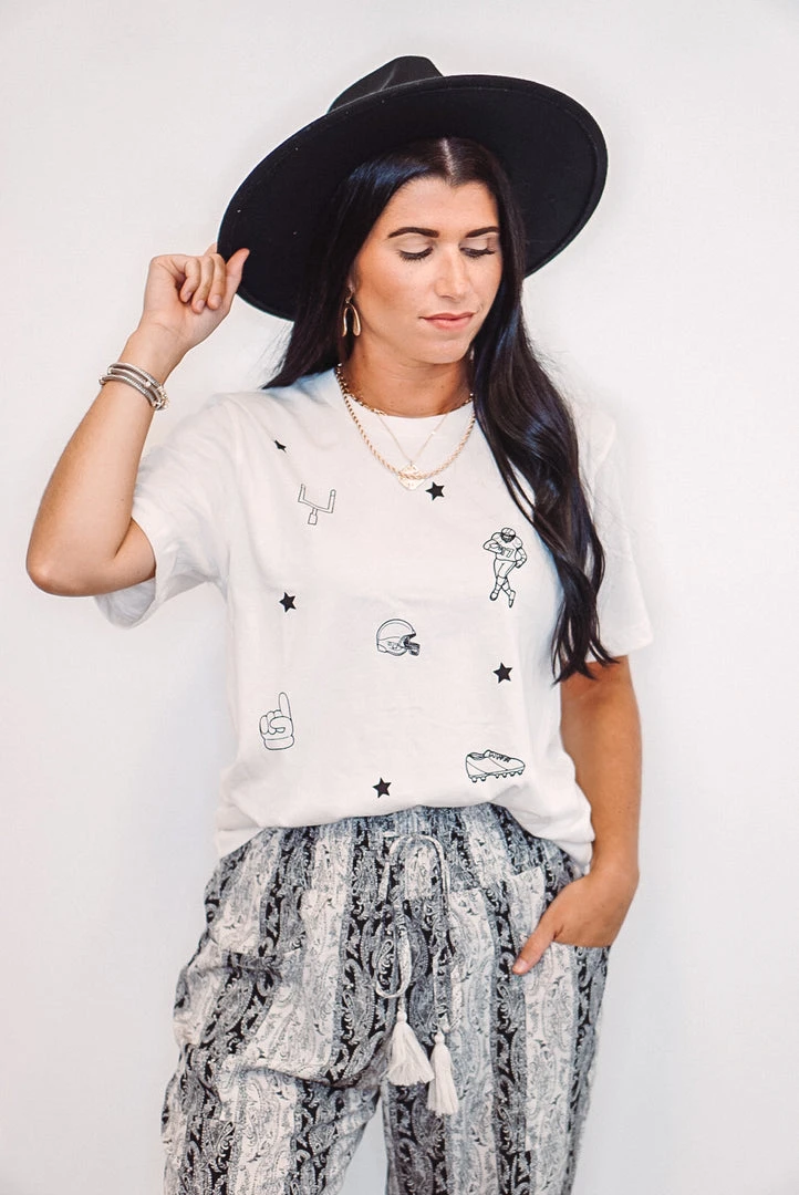 Be game day ready in this little cutie no matter who you’re cheering for! Whether it’s Friday nights under the lights or College football on Saturdays this is the perfect game day tee!! Love the simple black and white design…just add your favorite denim or a cute black skirt and you are set!