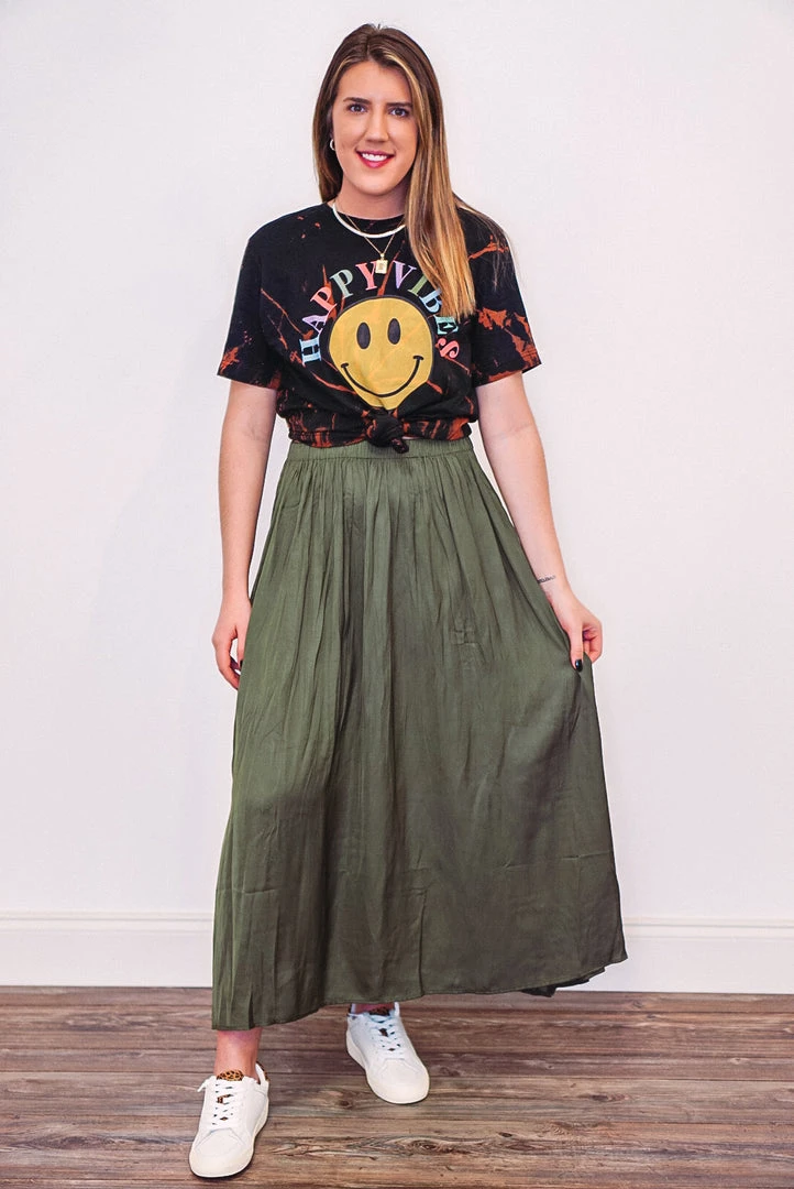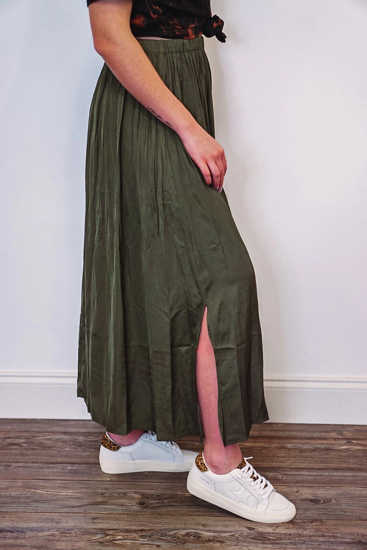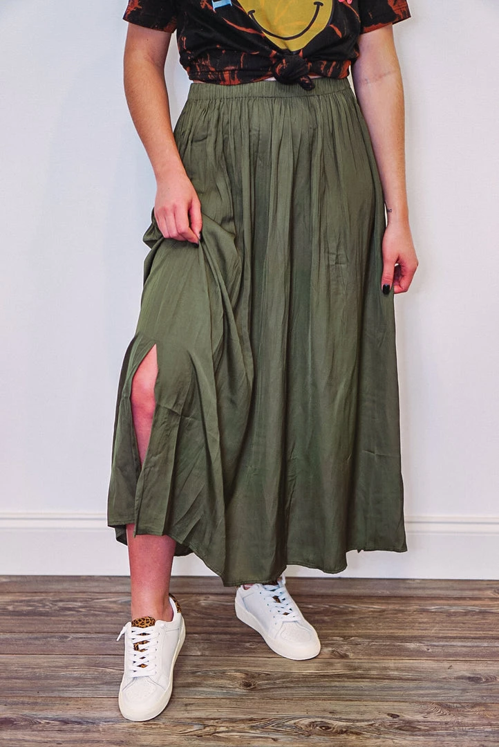We are in cuteness overload with this adorable maxi skirt! Featuring an elastic waistline, side pockets, and slits on each side of the bottom hemline. The perfect skirt, simple yet so pretty!