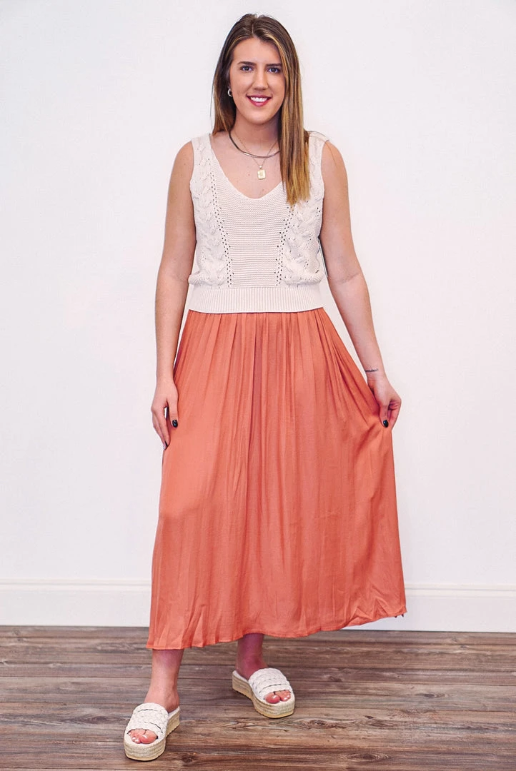 We are in cuteness overload with this adorable maxi skirt! Featuring an elastic waistline, side pockets, and slits on each side of the bottom hemline. The perfect skirt, simple yet so pretty!