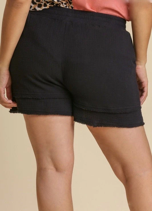 Black gauze elastic waist shorts with frayed hem