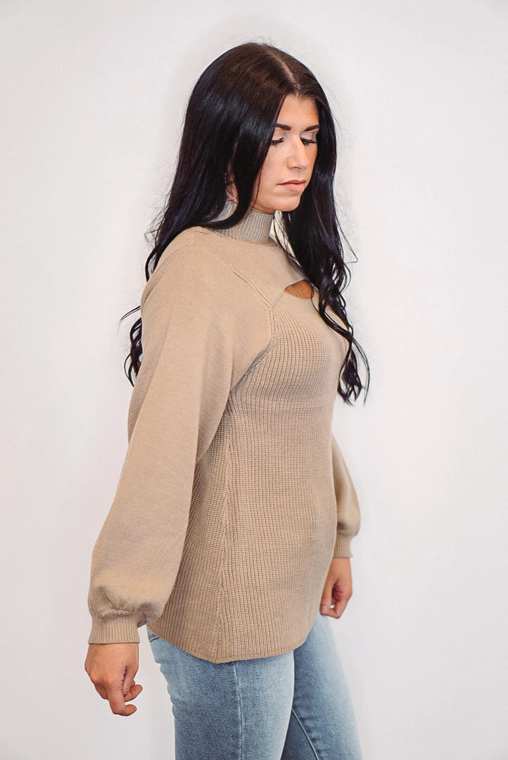 The perfect little sweater! We love the cutout front detail below the mock neck, it gives a flirty twist to a classic look. Featuring vintage latte ribbed knit fabric and ribbed cuff long balloon sleeves. This babe will have you looking and feeling fabulous!