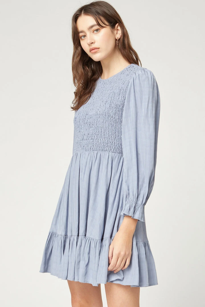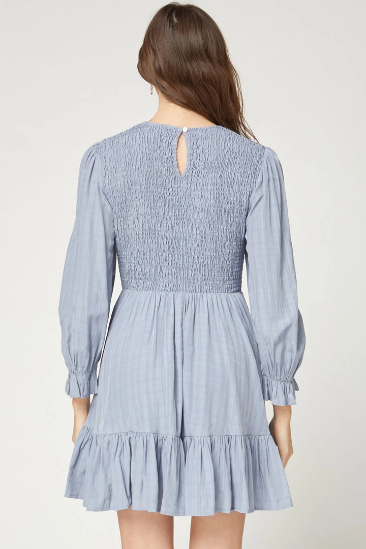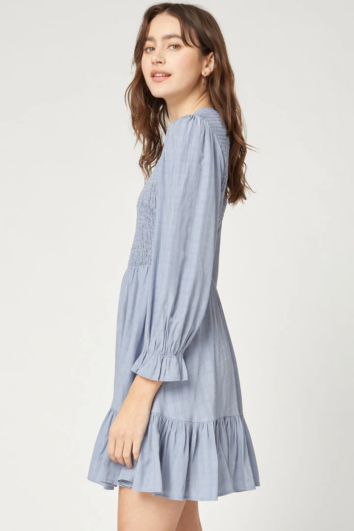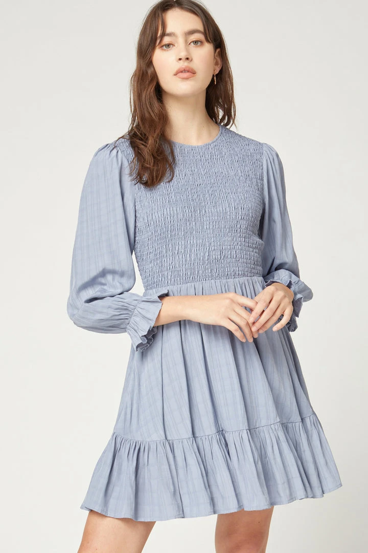 Dusty Blue Smocked Long Sleeve Ruffled Dress
