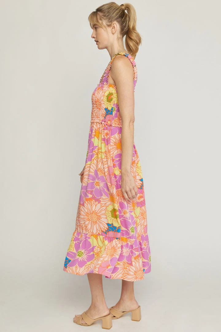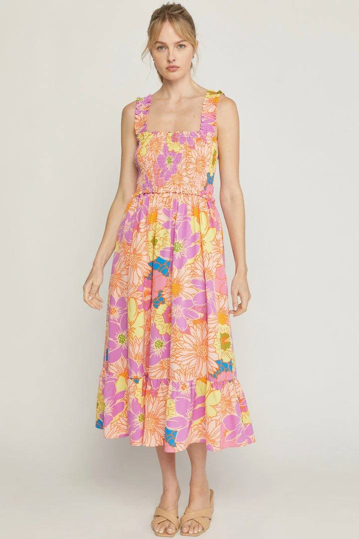 This vibrant floral print square neck midi dress is a must have for all of your summer occasions! Perfect for the beach or just a summer night date. Beautiful colored sleeveless dress featuring smocked bust and a ruffle skirt hem. Colors: lavender, pink, pale pink, dark blue, light yellow, mustard, green, and orange.