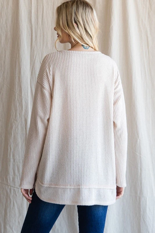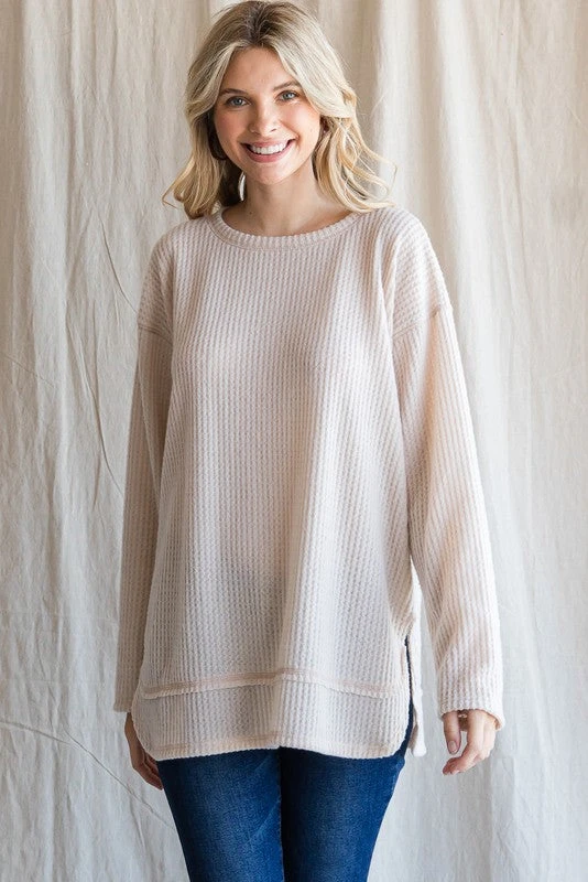 Ivory soft textured waffle knit long sleeve top for ladies