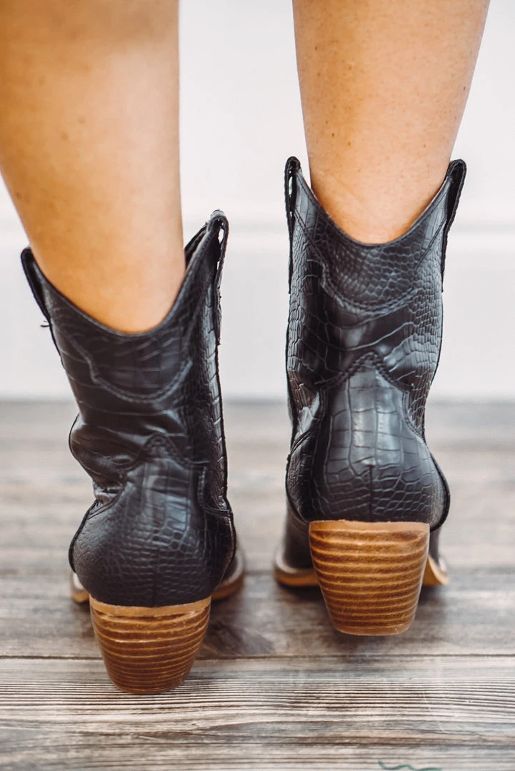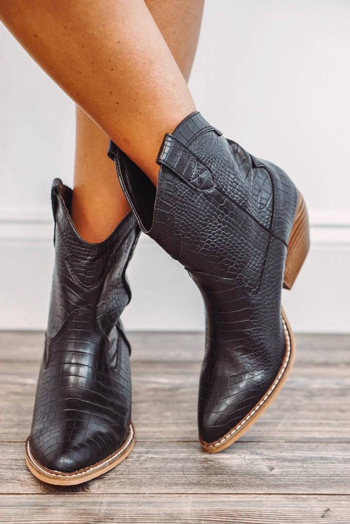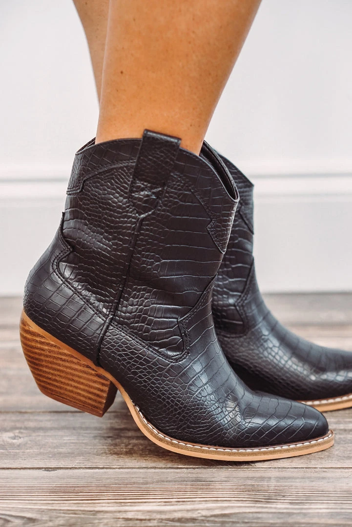 These sassy black faux croc texture western booties pair great with any outfit! The perfect shoe to go with everything from jeans and a graphic tee to skirts and sweaters. We love the leather like fabric and block heel for a classic combo .Perfect for concerts or just everyday wear!