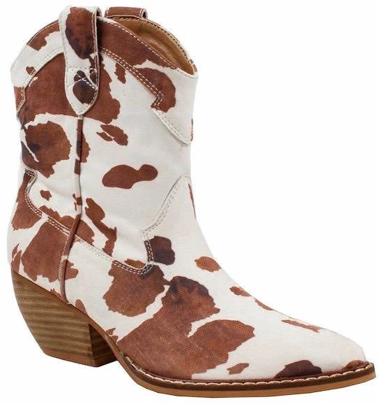 These sassy cow print western booties pair great with any outfit! The perfect shoe to go with everything from jeans and a graphic tee to skirts and sweaters. We love the suede like fabric and block heel for a classic combo. Perfect for your country concerts and wild west adventures!